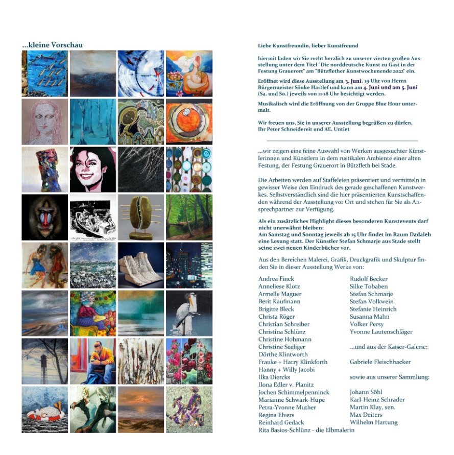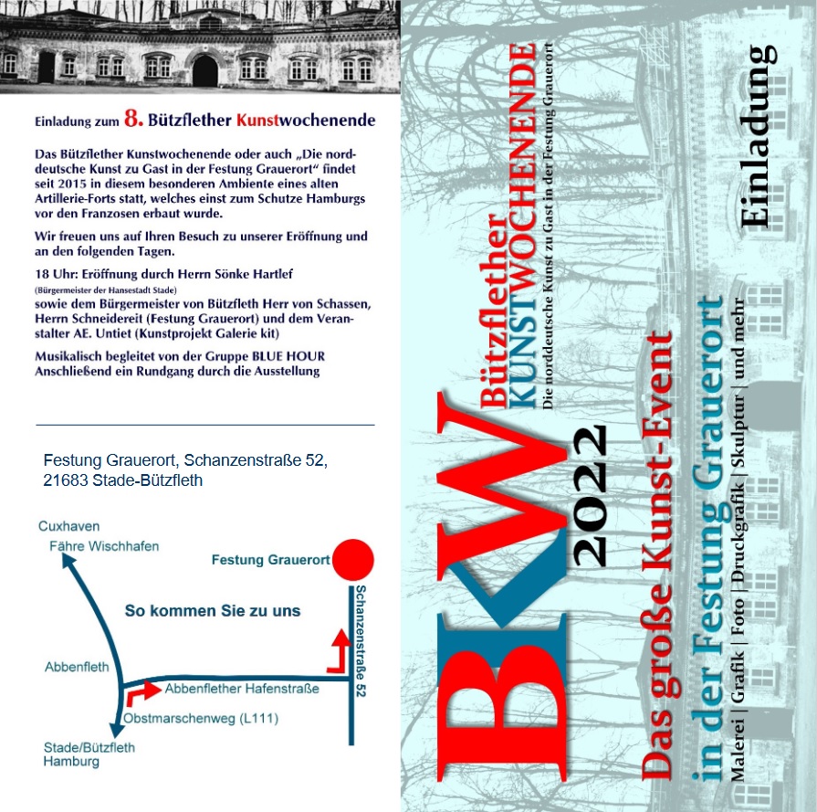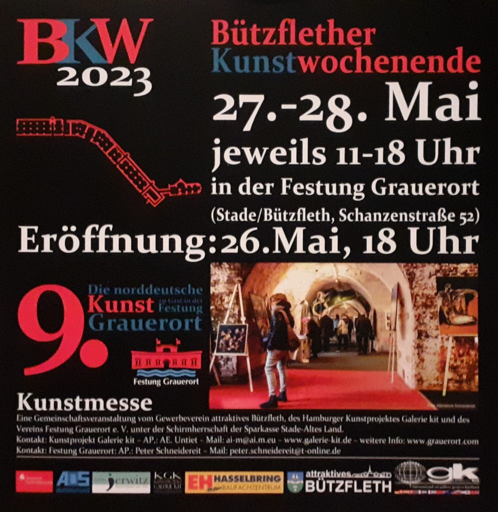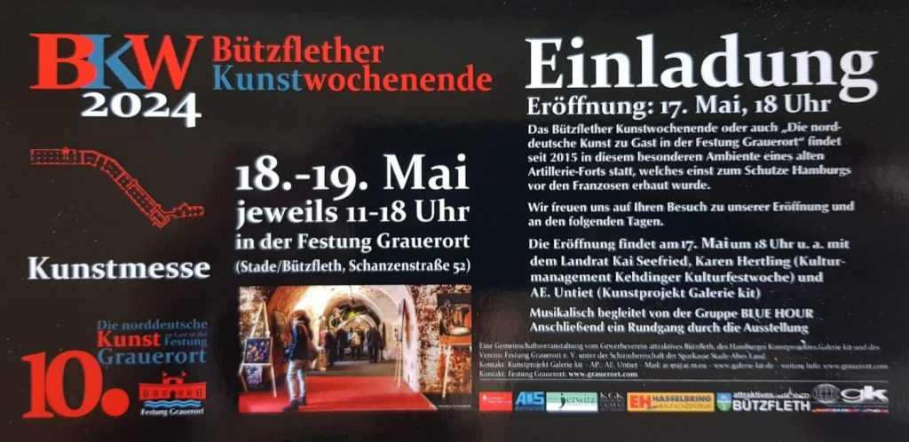 Zusammen mit anderen KünstlerInnen aus der Region werde ich am 4. und 5. Juni meine Bilder im Rahmen des Bützflether Kunstwochenendes – Die norddeutsche Kunst zu Gast in der Festung Grauerort – präsentieren! Alle Interessierten sind herzlich eingeladen!