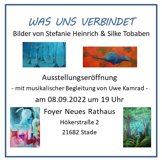 Vom 9.9. bis 7.10.2022 werden unter dem Motto Was uns verbindet Bilder von mir und Stefanie Heinrich im Foyer des Stader Rathauses zu sehen sein. Wie freuen uns besonders auf die Ausstellungseröffnung am 8.9., bei der wir sogar musikalische Begleitung haben werden. Wir laden alle Interessierten, Freunde und Bekannte herzlich dazu ein!