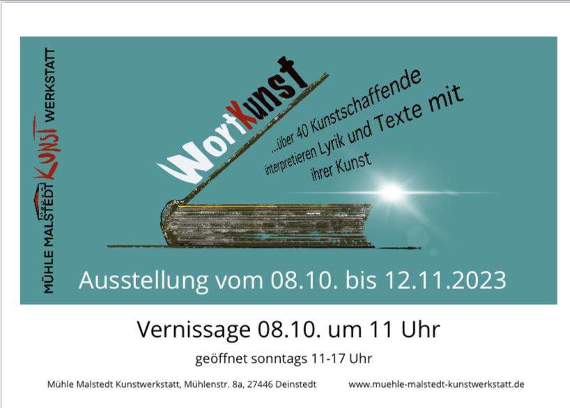 Im Oktober 2023 werde ich mit einem Werk in der Gemeinschaftsausstellung WortKunst in der Malstedter Mühle vertreten sein! Ich freue mich sehr auf die Veranstaltung! Mehr Infos unter