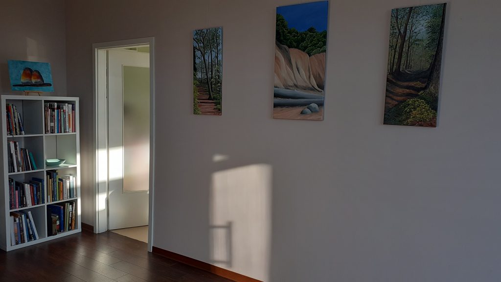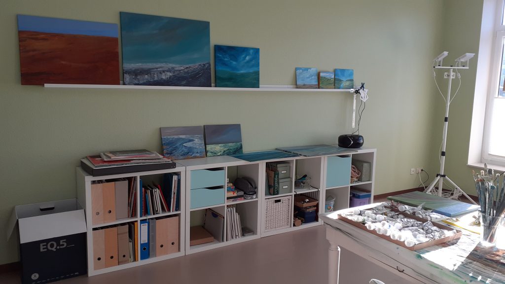Es ist so weit! Mein neues Atelier ist eingerichtet und ich verbringe dieser Tage die ersten „Malstunden“ dort! Ich freue mich sehr! Endlich befinden sich meine Malsachen (und auch nur die!) alle in einem Raum, müssen nicht mehr weggeräumt werden und füllen nicht mehr mein Esszimmer und diverse Ecken im Haus. Und so sieht es aus:
