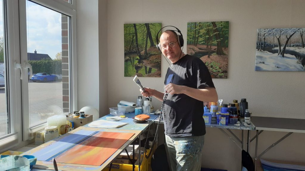 Mein fleißiger Gast hat wie erwähnt gerade eine sehr kreative und produktive Phase und fertigt wunderschöne neue Abstrakte Landschaftsbilder in Acryl auf großformatigem Papier an. Wer neugierig ist, kann mehr zu ihm auf seiner Website www.hinrich-schueler.com erfahren.